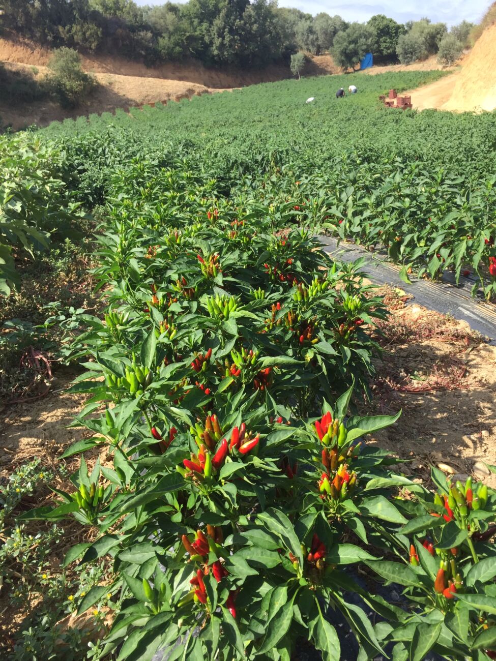 I campi di peperoncino sono rigorosamente all'aperto, dove coltiviamo due biodiversità autoctone: "naso di cane o roggianese" e “cornetto piccante".